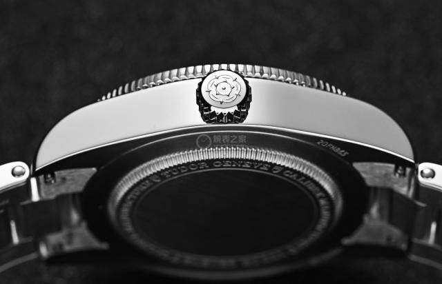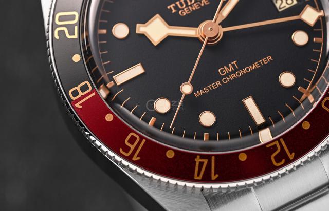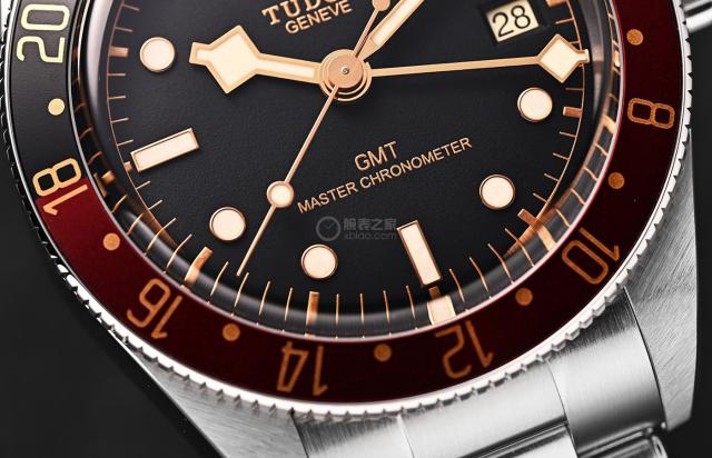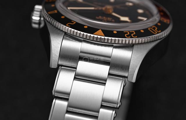 帝舵在不锈钢表壳正面进行了大面积的拉丝处理,侧面全部抛光。不锈钢紧固式上链表冠保证了手表的防水水平。 200 米。正向的 24 小时 GMT 在黑色和红色的装饰下,表圈更加显眼。与劳力士铝制" COKE 圆圈上的白色刻字设计不同,帝舵的黑红表圈则采用镀金刻字,复古气息更浓。