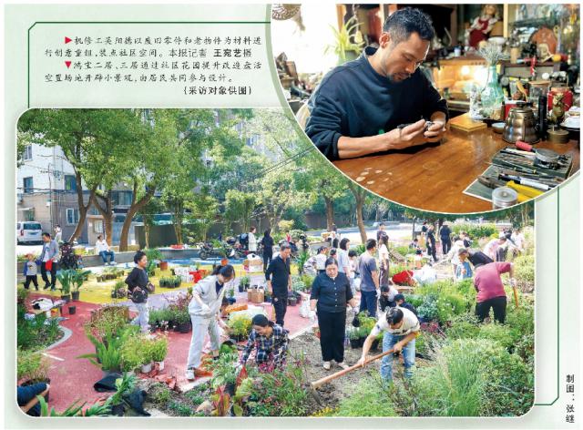 左下:鸿宝二居室、三居室通过社区花园升级改造盘活闲置场所,开辟小景观,由居民共同设计。(受访者提供图片) 绘图:张继