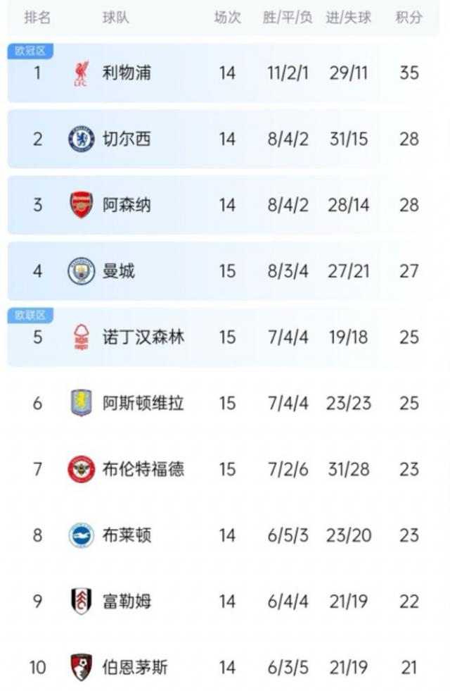 曼城 15 轮积 27 得分,继续排名第四,不过多赛一轮距离领导利物浦。 8 得分,夺冠渐行渐远。诺丁汉森林 15 轮积 25 分数,升至第五,维拉 15 轮积 25 得分,因为净胜球落后排名第六。布伦特福德 15 轮积 23 分数,升至第七,争四形势混乱。此外,曼联 2 连续输球后,积分仍然是 19 分数,排名第十三。