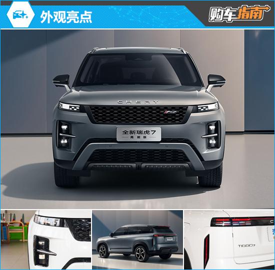 2025 款奇瑞瑞虎 7 高能版外观采用全新风格,车头官方称之为“虎跃前脸”设计。发动机舱盖前端有奇瑞品牌的英文字母。 LOGO。与此同时,新增的黑色网状前格栅” N “字眼专属标志,两侧分体式大灯的日行灯部分采用了类似跑车格子旗的日行灯。 LED 灯带,大大增强了运动感。车尾设计简单,贯穿式尾灯也有“格子旗”元素。经过包围底部分体式银色防擦装饰板,营造出极佳的动感氛围。