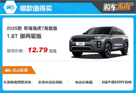 2025 款奇瑞瑞虎 7 共推出高能版 4 汽车,售价区间为 10.79-13.99 一万元。同时,现在买车的时候,可以享受很多买车的权益(详情请咨询当地经销商),比如现金礼、流量礼、高能礼、焕新礼、质保礼等等。