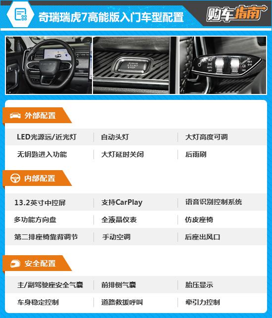 2025 款奇瑞瑞虎 7 高能入门级车型基本功能齐全,还配有自动大灯。 LED 远 / 近光灯和第二排座椅背部调节等基本功能可以满足基本的家庭需求。但是这次没有推荐入门级版本,根本原因是性价比更高的车型。