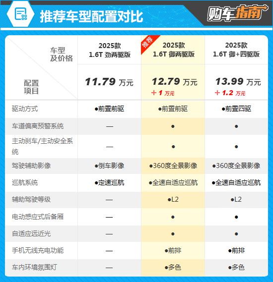 通过对比设备不难看出,推荐车型比较低级的劲二驱版多了一些。 L2 级全速自动巡航、电感后备箱、自适应远近光、前排手机无线充电、混色可调的车内氛围灯等功能,更符合当下主流,可提供跨级用车体验。而且两者只有区别。 1 万元,物有所值。