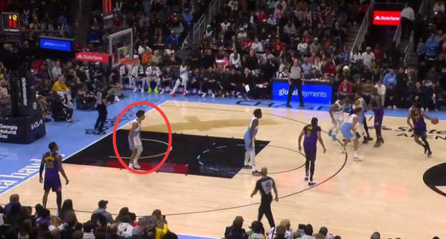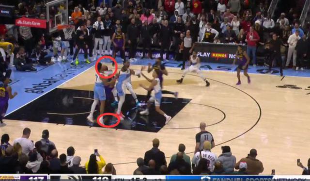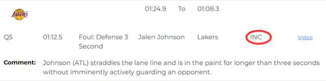 第二次漏判,发生在离加时赛结束时。 1 分 12 秒。杰伦,当时的老鹰 - 约翰逊在我们雷区停留了三秒以上,没有积极防守对方球员。这是一个三秒防守的违规行为。这一次,湖人错过了判断,老鹰盈利了。
