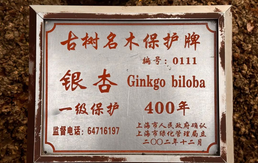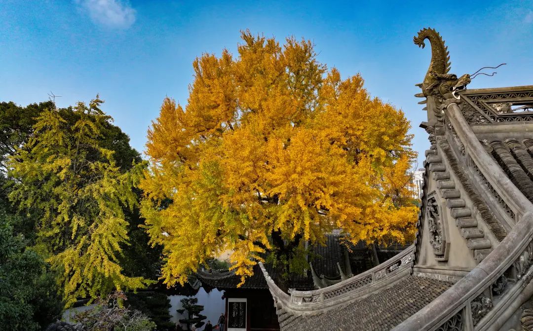 上海豫园有两棵银杏树,都有400多年的历史。这两棵银杏树不仅是豫园的精神财富,也是历史的见证。400年,银杏树下立着“古树名木保护牌”,编号为0111号,上面写着“一级保护”二字,显示了它在古树保护中的重要地位。另外一棵465年的银杏树,据说是明嘉靖年间豫园主潘允端亲自种植的,树高21米,至今仍枝繁叶茂,生机勃勃。这两棵银杏树相对较远。在蓝天白云和豫园独特的龙墙的映衬下,它们不仅为游客在秋天提供了美丽的风景,也成为豫园独特的风景。