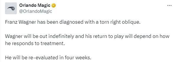 北京时间 12 月 8 日,据名记 Shams 报道称,弗朗茨,魔术队前峰 - 瓦格纳被诊断为右腹斜肌撕裂,将无限期停战。他将在四周后再次接受评估伤势。随后,魔术官方确认了这一消息,最后一次对费城造成伤害。 76 人类比赛。