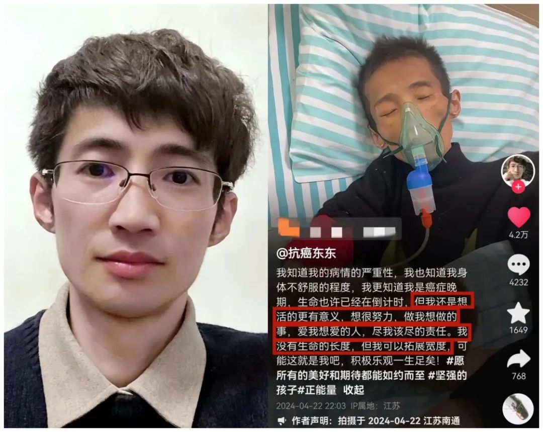 今年4月26日,“80后”博主“防癌事物”在家中死亡。在账号数据中,他透露自己曾经是一名医生或两名未成年子女的父亲;患有低分化胃癌,后期骨、肺、肝、腹膜多处转移。