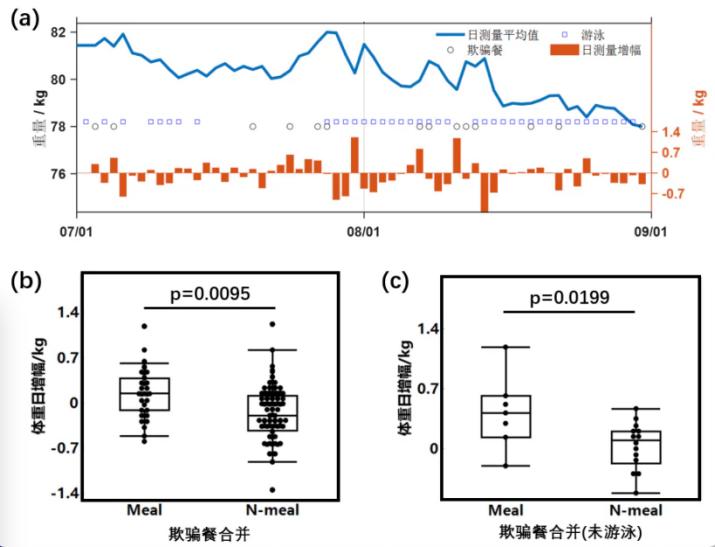在王春承的文章中,游泳减肥月的日均体重变化和欺骗餐和游泳数据。摘自受访者的文章