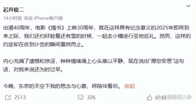 中山美穗与柏原崇合作的《情书》被称为日本第一美少女和美少男。柏原崇已经退出圈子很多年了,他没有回应这件事。导演岩井俊二在微博上发消息悼念,表示已经和中山美穗约好了圣诞节之旅,庆祝《情书》上映 30 周年纪念日,但这样的约定却嘎然而止。