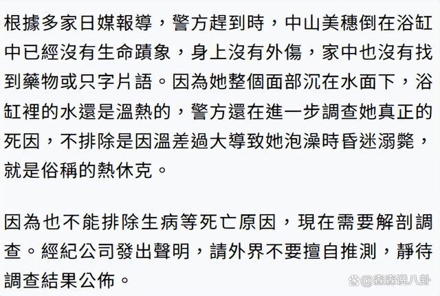 12 月 7 日本媒体揭开了中山美穗去世的细节。当警察到达时,中山美穗倒在浴缸里,整张脸沉入水中。没有外伤,浴缸里的水还是温的。为了调查死因,尸体将被解剖。