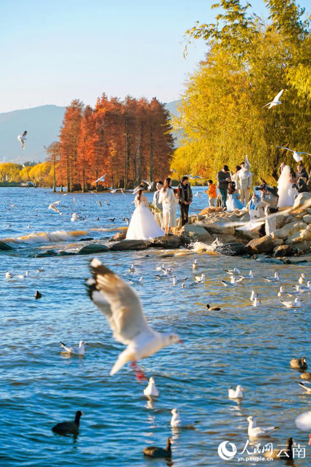 大理洱海云南:红嘴鸥和水杉点缀着洱海的冬日浪漫。