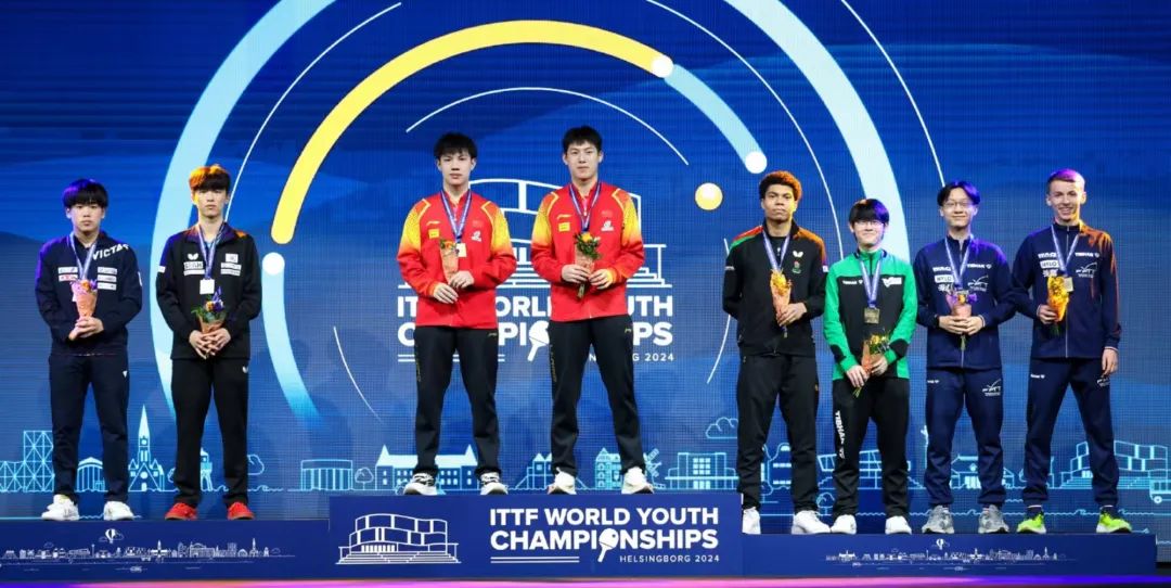 在2024年世界青少年乒乓球锦标赛领奖台上,温瑞博。