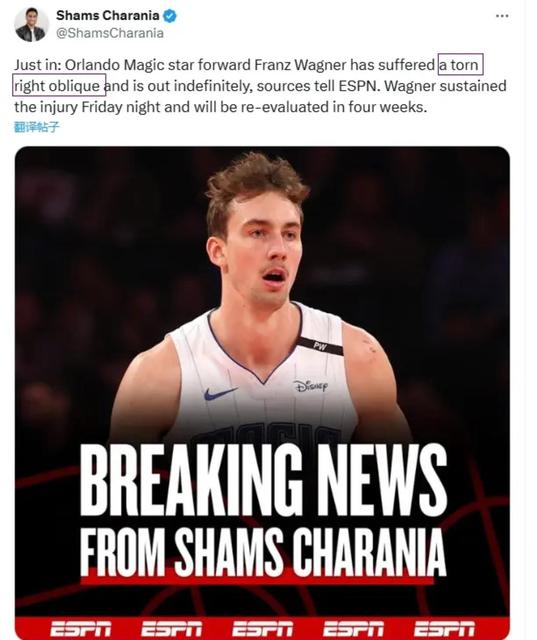 据 ESPN 名记 Shams 报道,NBA 消息人士透露,奥兰多魔术前,弗朗茨瓦格纳右腹斜肌撕裂,宣布永久缺席比赛。他将在周围之后再次接受伤势评估。据悉,弗朗茨瓦格纳正在与费城作战。 76 人类在比赛中受伤。