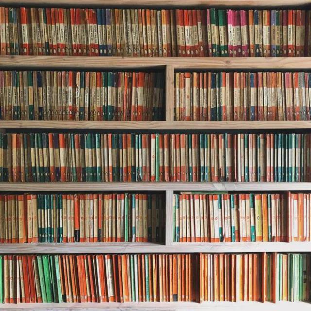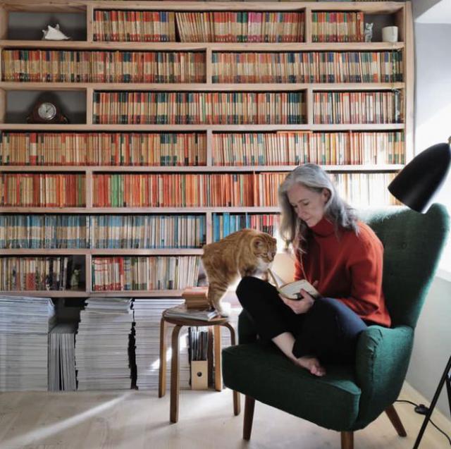 她一生的收藏——数百本企鹅兰登绝版书整齐地编码在这个书架上。