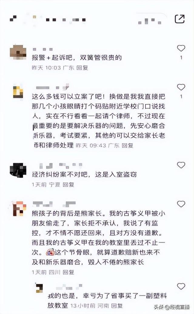 范老师说他们也和书法机构的老师沟通过,书法老师也很配合,辞退了其中一个损坏乐器的学生。然而,他们的主要责任是父母。目前,父母还没有出来支付乐器。