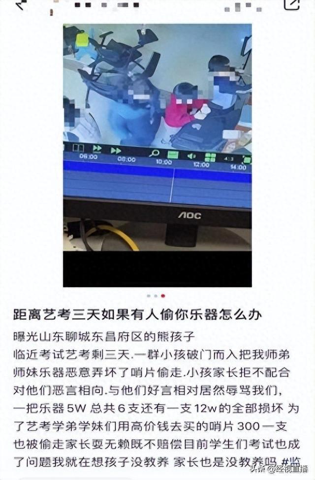 12 月 5 日本,在山东聊城,有网友在社交平台上发帖称,距离艺考三天,一群孩子破门而入,恶意损坏学生乐器,盗走哨片。孩子的父母拒绝配合,影响了考生的考试。