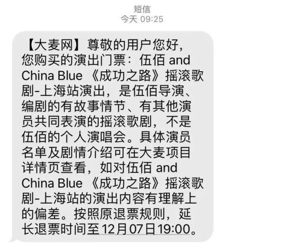 今日(12月7日),票务平台大麦向已购票客户发送消息提示表演内容,并延长退票时间。