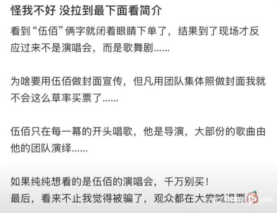 要求退款的观众在社交平台上表示,官方宣传资料是误导性的,导致他们误以为演出是伍佰个人演唱会。“为什么要用伍佰做封面宣传?但是,如果我用团队集体照片做封面,我就不会那么轻率地买票了。”