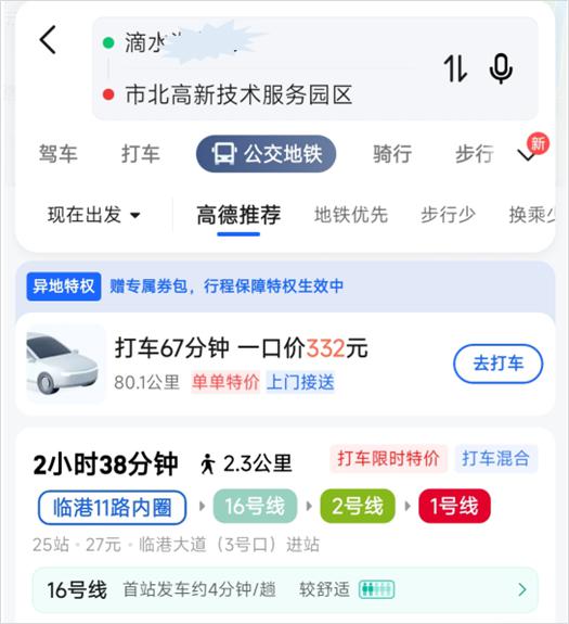 只有可以选择 16 号线普通版,全程 12 站,耗时 1 个小时 10 分钟