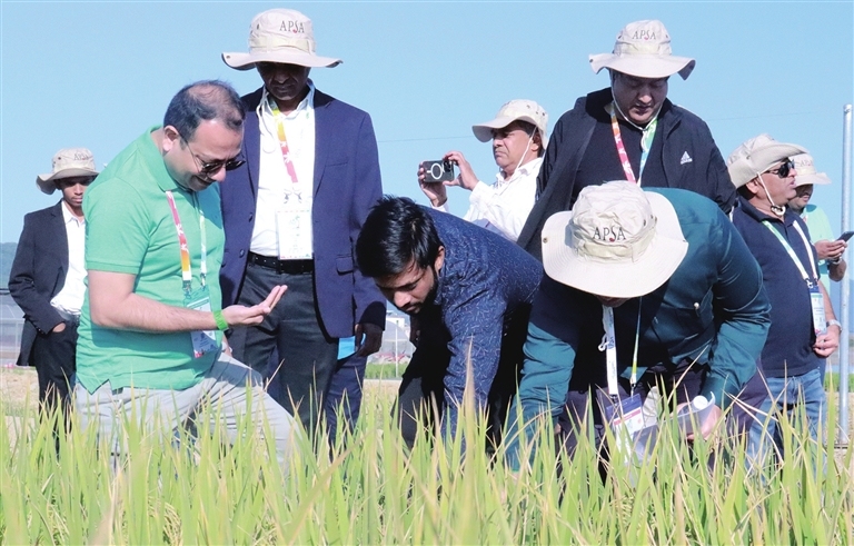 在海棠湾三亚水稻国家公园,嘉宾们研究了100亩再生水稻示范基地,详细了解了海南好米金奖、特殊专用水稻品种、水稻种质资源等。