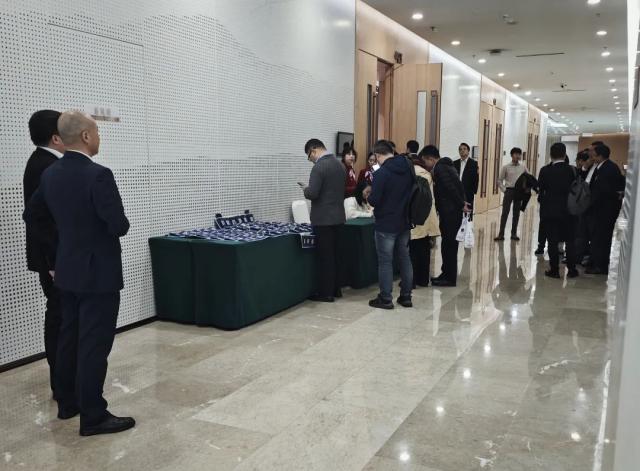 会议厅外有很多工作人员,有的负责维护现场秩序,签到处的服务人员逐一核对参与者的身份。参与者需要将手机和所有电子设备交给会议厅入口处的手机袋中,并由专人保管。
