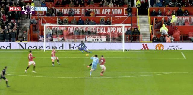 易边再战,曼联再次闪电失球,B 费用后场回传失误,森林迅速反击,摩根 · 吉布森 - 怀特禁区弧顶起脚远射,足球又低又正,本来威胁不大,但是红魔门将安德烈烈 · 奥纳纳的判断失误,只能看到足球在脚下进入网络,曼联 1-2 再次落后。