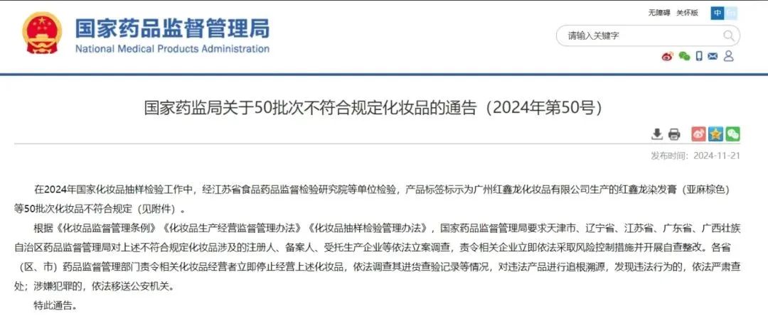 1. 广州红鑫龙化妆品有限公司生产的2批红鑫龙染发膏(亚麻棕色),不合格项目为:成分核对