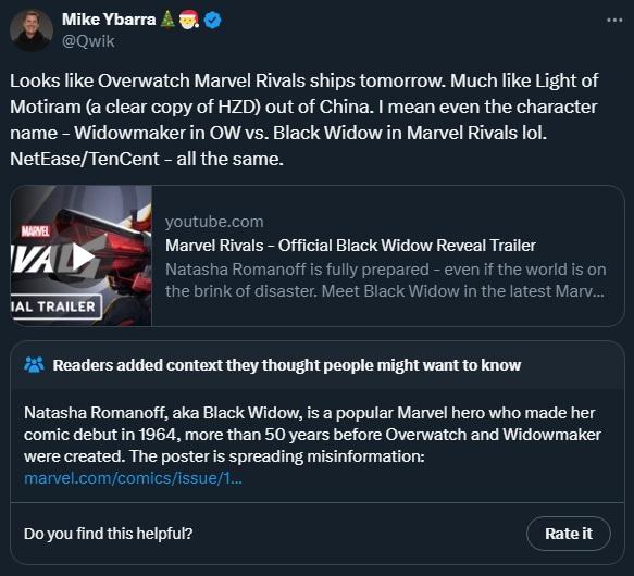 暴雪前总裁 Mike Ybarra 在社交平台上发帖称,网易的《漫威漫画争锋》应该叫《守望先锋:漫威漫画争锋》,《荒野起源:零曙光》再次上演,甚至人物名称也差不多。—— Windowmaker(黑百合)vs. Black Widow网易(黑寡妇) / 同样的腾讯也是如此。