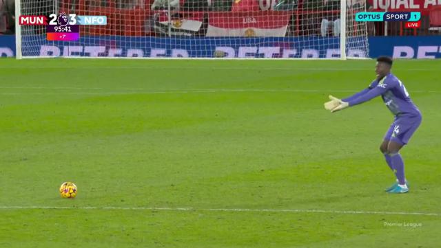 具有讽刺意味的是,足球已经被放在了犯规的地方,梅森被放倒了。 · 芒特把自己放好,绝对没问题,可以直接开球。奥纳纳不得不向前移动球。裁判让他回去,他没有退位,浪费了将近一分钟。当时红魔落后一球,奥纳纳这样做,诺丁汉森林球员都笑了。