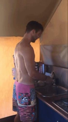 尤其在凉水出浴时,全身肌肉紧绷,八块腹肌完美得让人尖叫。另外,在家做家务,隐隐约约的臀部可以上热搜,这个臀部,让小姐姐看了也可以自叹不已。。