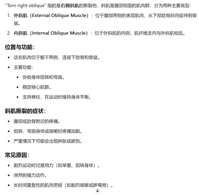 两位当家明星,连续遭受同样的伤病, NBA 相当罕见。目前魔术 16 胜 9 尼克斯位居东部第三,领先第四。 0.5 个胜场。当小瓦受伤时,魔术就会下降。掌教搜索了右斜肌撕裂的受伤位置和症状,大家可以看一下人工智能解释: