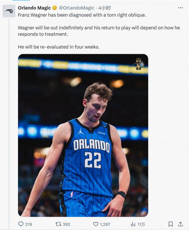 北京时间 12 月 8 一天早上,奥兰多魔术官方宣布,球队前峰小瓦格纳遭受右腹斜肌撕裂,永久缺席,小瓦格纳将在 4 接受周后的重新评估。一些球迷应该还记得,魔术状元班凯罗上个月也遭受了右斜肌撕裂,已经停战超过了。 5 周的时间。