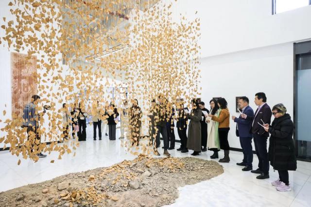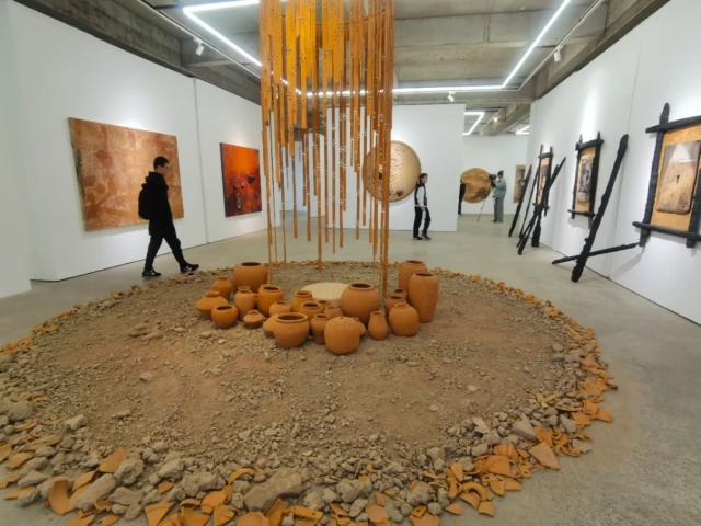 走进美术馆,第一件名为“听土”的原生态装置艺术让人眼前一亮。原生态的黄土在生活中随处可见,中间有大大小小的陶罐,上面挂着长长的陶片。靠近它就像听到了土壤说话的声音。而且像这样展示形式新颖的作品还有很多。2000,从负一层到地上一、二、三层。 剩下的作品分为 6 展览发起人宋陈介绍,从第一单元“大音:希声之土”到第六单元“归藏:永久之土”,是宇宙诞生之初到超越性感知和观念回归整体宇宙生态意识的轮回。