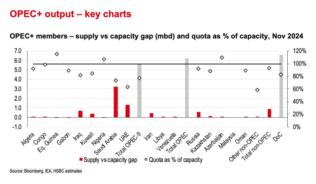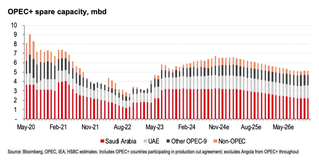 汇丰觉得,OPEC 增产减产计划只是“混过去”,并未解决总产值过剩的根本问题。报告预计到2026年底,考虑到仍有2组减产措施没有解除(至少到2026年底),OPEC 缓冲产能仍将达到520万桶/日,仍然高于长期平均水平。