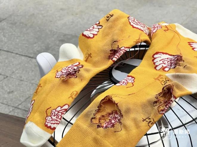 棉袜子被热熔化成一个大洞,现场伴有烧焦味。
