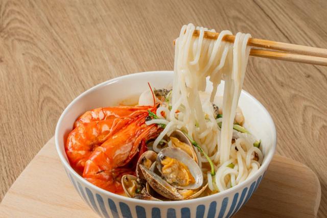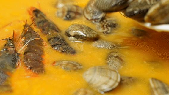 3. 把煮好的米粉捞出来冷却,然后用锅里剩下的汤把河鲜类食材煮到断生。