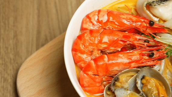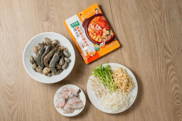 鲜虾 100 克、花蛤 100 克、鱼肉 150 克、细米粉 200 克、豆苗 100 克、千张丝 100 克、豆芽 50 汤底调味品克,汤底 1 袋