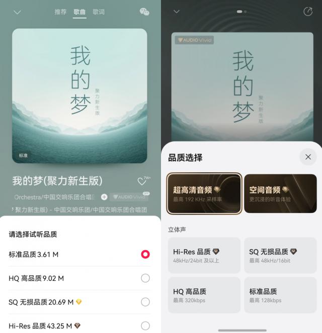 每首歌的音质在升级前可以选择如下:标准, HQ 、 SQ 音质,部分有 Hi-Res 、 AudioVivid 空间音频。