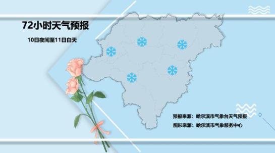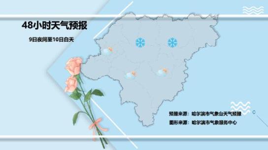 9日晚至10日白天:9日晚呼兰、巴彦、木兰、通河下雪,其他区域阴天,10日白天全市阴天;西南风2~三级;最低温度-22~-17℃,最高温度-13℃~-9℃。