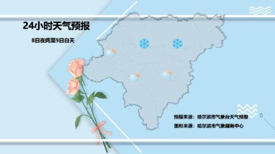 八日晚上到九日白天:大兴安岭,黑河,伊春,齐齐哈尔北部,绥化北部阴天有阵雪,其他地区有时晴天多云。