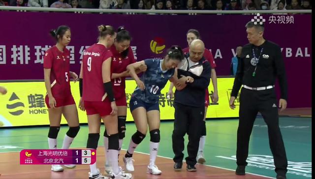 在北京 2:3 在输给上海的比赛中,出现了一个悲剧的场景:中国女排自由人王梦洁受伤了!原来,当金烨主攻一传时,他倒退了。王梦洁避开了它,被撞到了膝盖。希望没关系!