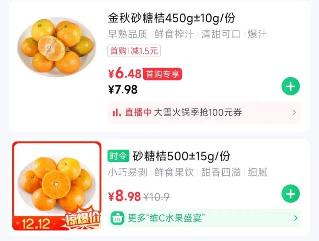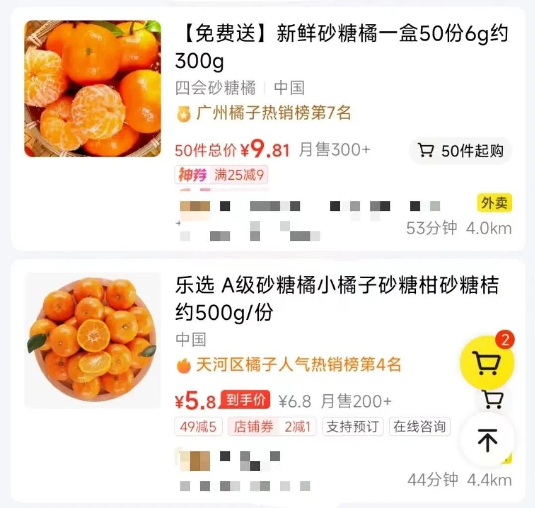 8日,广州日报新花城记者在外卖小程序上看到,一斤糖橙的价格在8元-10元之间。但是很多商家的糖橙价格在10元以上,有的接近15元/斤。其中,一家超市的糖橙价格为8.98元/份(5000元/份)±15克)