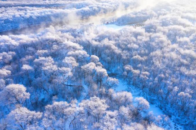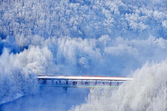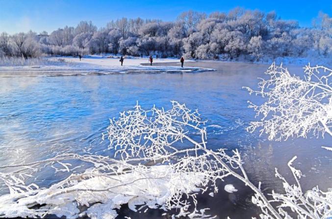 沿着蜿蜒的小路走进景区,仿佛踏入了一个童话世界。所有的树都被晶莹剔透的冰挂住了,就像玉树的琼枝,美不胜收。微风吹过,冰霜闪烁,清脆的声音像大自然演奏的精彩运动。