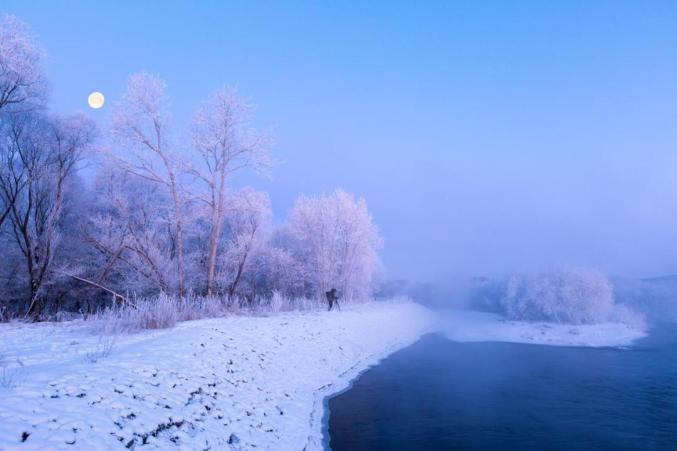 站在湖边,湖水像一块巨大的水晶石一样宁静。雾凇的倒影在湖面上摇曳,与蓝天白云相得益彰。远处的群山也被白雪覆盖,蜿蜒起伏,像一条白色的龙蜿蜒曲折。