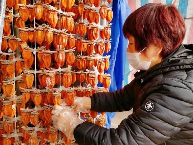 每年10月,柿子开始变大变红,当地人迎来了收获季节,冬月的柿子也在这个时候做好了准备,等着柿子娘们“捏”成柿饼。