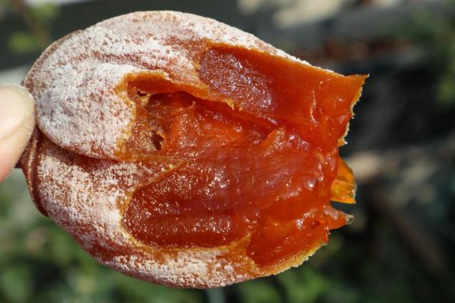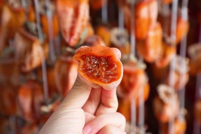 橘红色的富平大柿子,想要变成润如膏脂的柿子,需要收集、去皮、挂晒、捏、盖等。 12 道路过程,经过 48 天然挂霜干燥而成。