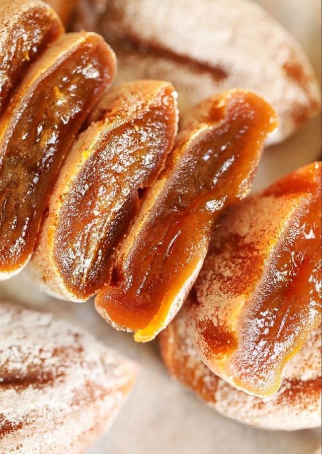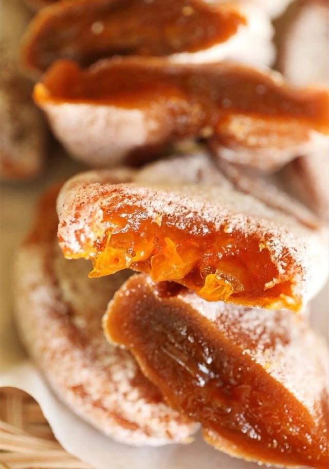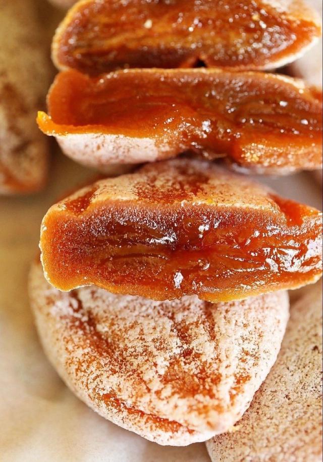 表面覆盖着微甜的糖霜,咬一口是柿饼特有的韧性。里面那颗明亮柔软的心似乎随时都会流出来。光看就很馋。 ~