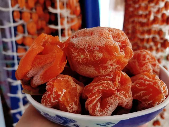 但是这种美味的柿饼也有一个很大的缺点,柿饼表面的霜是天然结晶糖霜,温度超过 10 ℃糖霜即化,收到后要尽快食用。