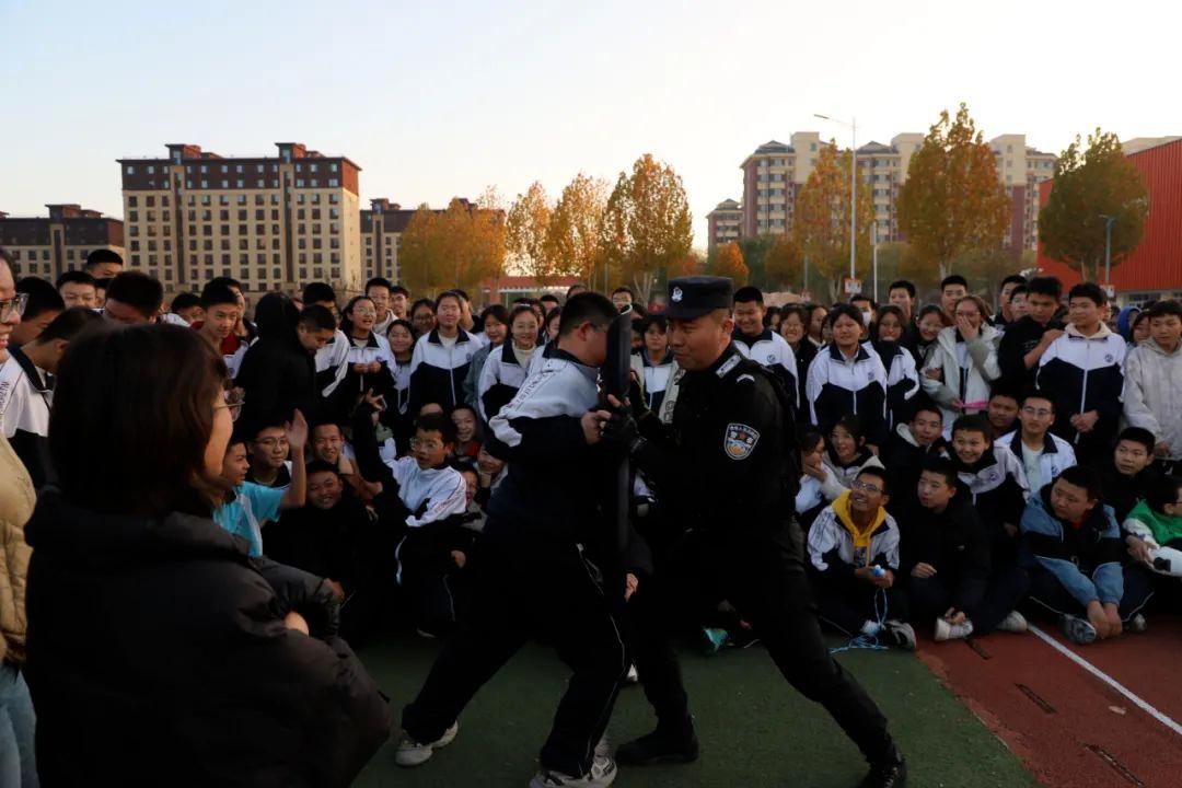 现场,特警装备齐全,展示多项专属训练和实战演练。特警传授防身技能时,学生自愿上台练习,近距离学习一招一式,引发学习热潮。