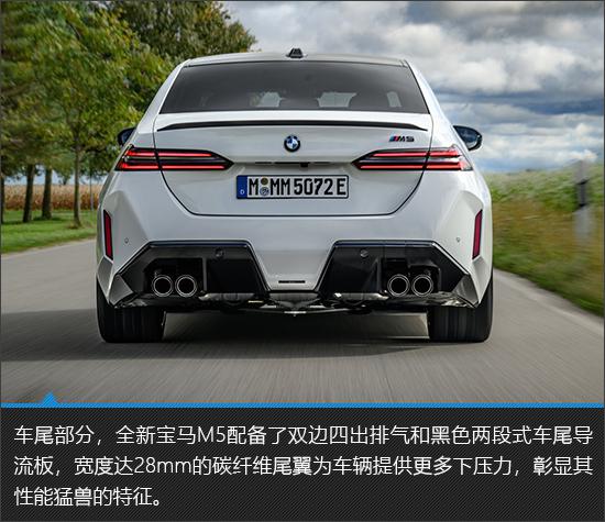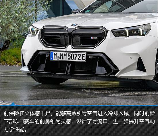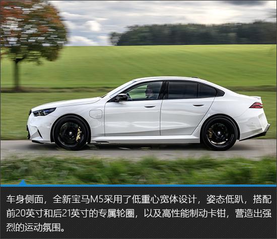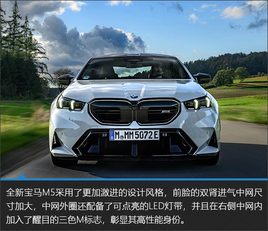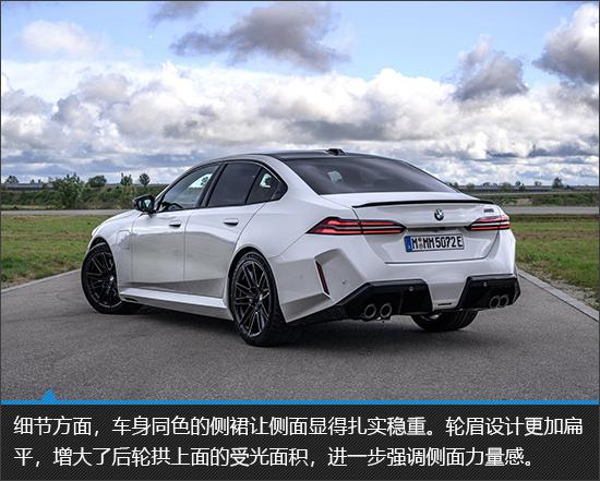 全新宝马 M5 与更激进的设计风格相比, 5 该系车型造型更具运动感,并延续了宝马。 M 宽体型设计,低姿态营造出强烈的运动氛围。外观细节的装饰采用黑化处理,不仅在视觉上更具运动感,还增强了整车的精致感。
